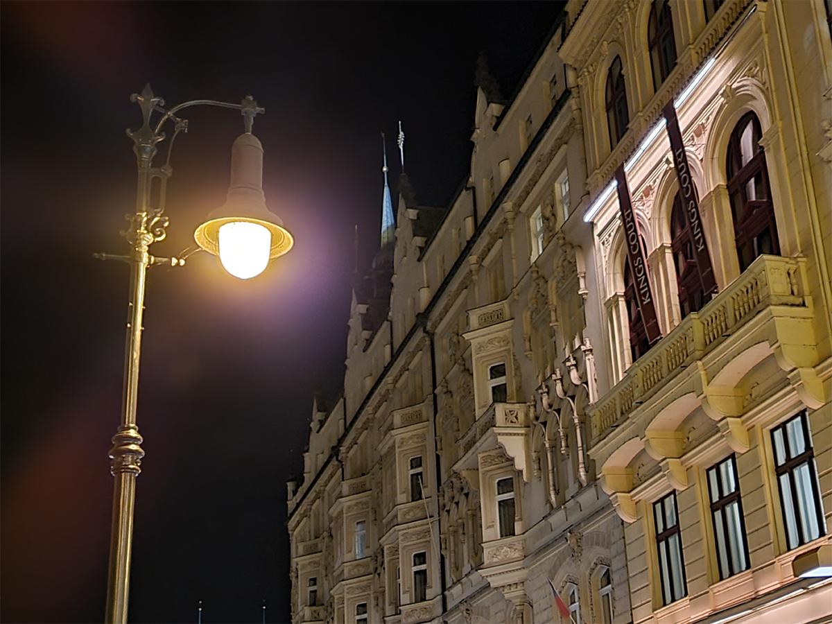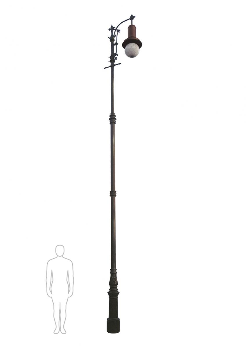 Replika historického ozdobného stožáru z konce 19. století s litinovou paticí včetně repliky měděného svítidla s opletenou koulí v jednoramenném provedení