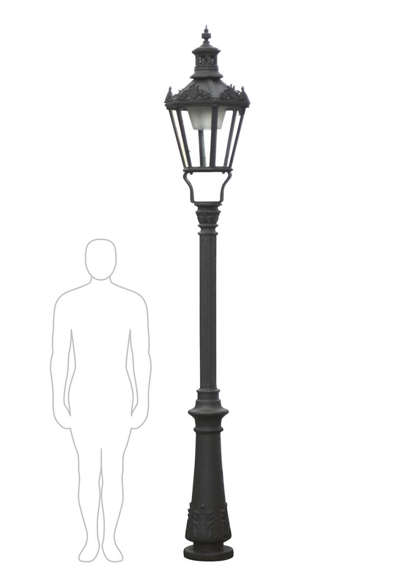 Zmenšená replika původní historické litinové lucerny na zmenšeném litinovém sloupu z konce 20. století.